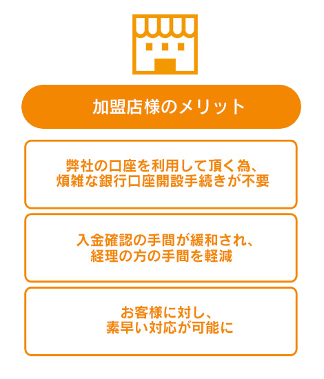 加盟店様には自動で振込の通知が送られるので、その通知を受けることにより、お客様へのサービス提供のスピ-ドアップを実現いたします。