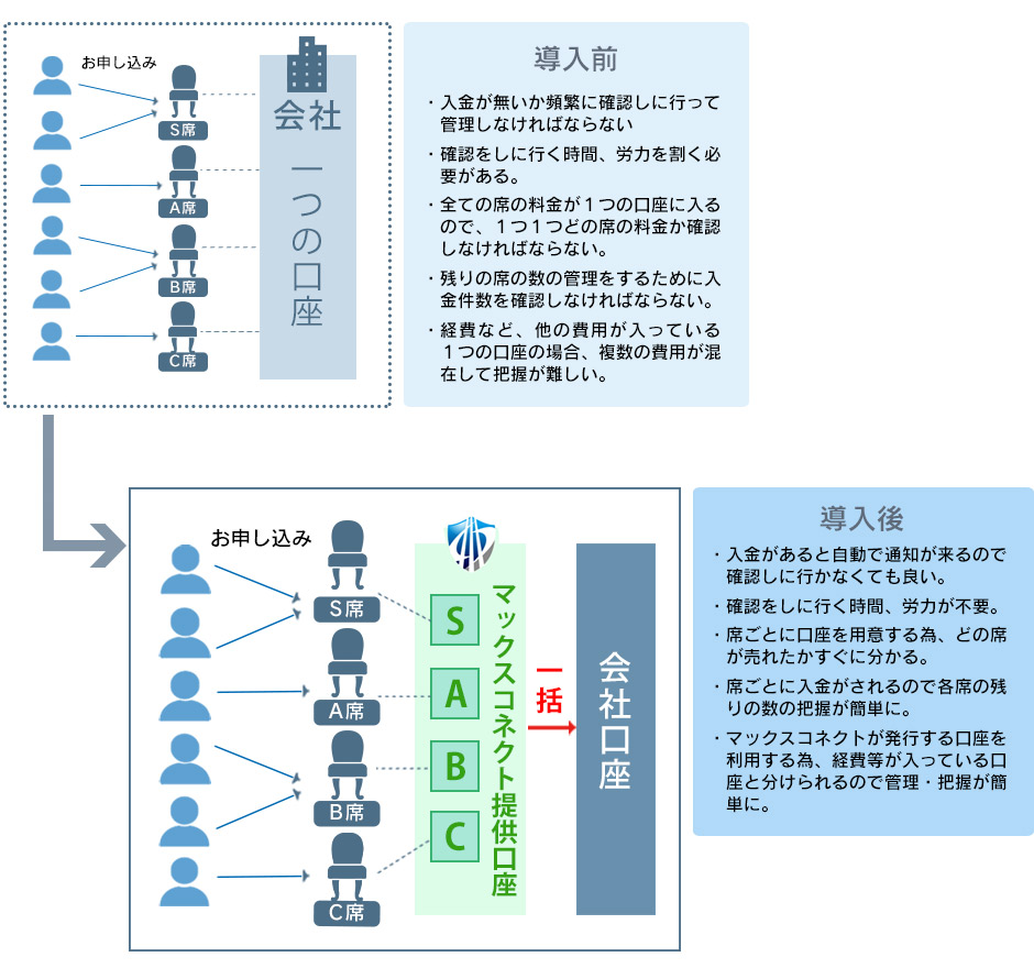 例えばイベント会社がS・A・B・Cと4種類の席を既存の銀行振込で販売し、会社が所有する口座が1つしかない場合、左図のように各席の料金がお客様から一括で一つの口座に振り込まれる為、管理が困難になります。