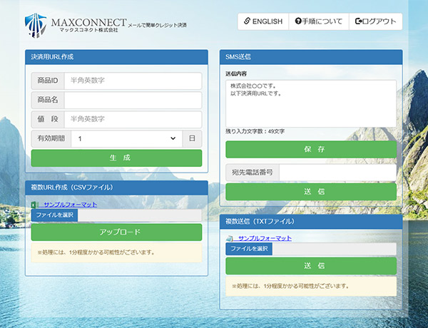 マックスコネクトのSMS電話決済は、クレジット決済用URLをSMSで送付することで、お支払いをご案内するクレジットカード決済サービスです。この決済サービスは一つの画面でURL生成から決済URL送付まで簡単に行うことが可能なサービスです。