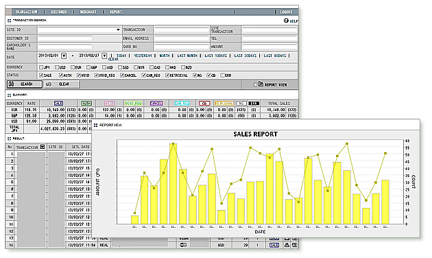 弊社マックスコネクト決済代行サービスでは、全ての加盟店様皆様に、非常に使いやすい決済管理画面を追加料金なしでお使い頂いております。こちらは全てのタイプのサービスの加盟店様でご利用頂けます。